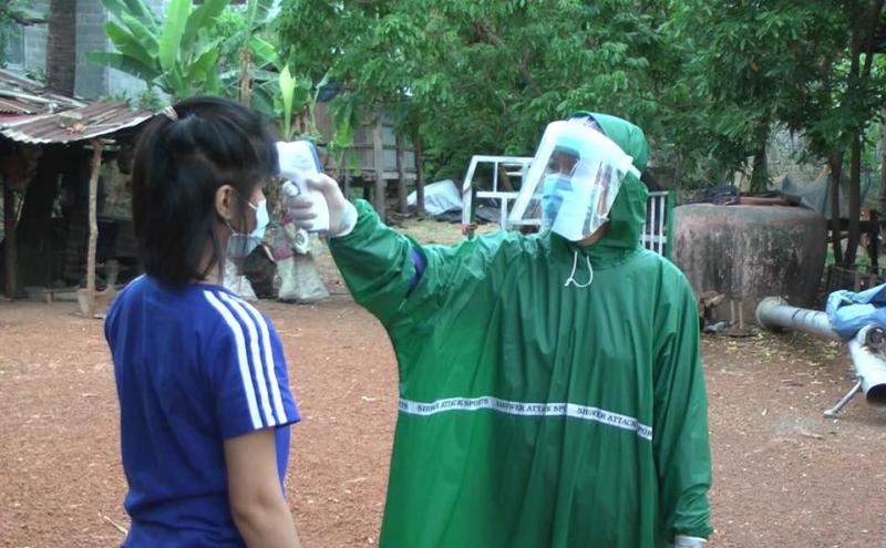 ภาพกิจกรรม :อสม.สกลนคร เฮ ญาติใกล้ชิดผู้ติดเชื้อไวรัสโควิด 19 รายแรก ผลตรวจออกแล้ว ไม่พบเชื้อ เดินหน้าคัดกรองเต็มที่ ที่บ้านหนองปลาตอง หมู่ที่ 8 ต.นาเพียง อ.กุสุมาลย์ จ.สกลนคร ภายหลังที่ทราบข่าวจากสำนักงานสาธารณสุขจังหวัดสกลนคร แจ้งว่า ผลตรวจเชื้อโควิด 19 ของญาติผู้ติดเชื้อไวรัสโควิด 19 รายแรกในจังหวัดสกลนคร ซึ่งเป็นคนในครอบครัวจำนวน 4 ราย (ย่า พ่อ แม่ และลูกชาย) เมื่อวันที่ 7 เมษายน 2563 ที่ผ่านมา ไม่พบเชื้อโควิด 19 ทั้ง 4 ราย สร้างความดีใจและสบายใจขึ้น ทำให้วันนี้ กลุ่ม อสม. ประจำหมู่บ้าน นำโดยนายสุรศักดิ์ ลาชัย ผู้ใหญ่บ้านหมู่ที่ 8 จึงได้ร่วมกันแต่งกายสวมหน้ากากอนามัย Face Shield ถุงมือ รองเท้าบูท และผ้าคลุมพลาสติกทั่วร่างกายอย่างรัดกุม เดินรณรงค์ประชาสัมพันธ์และเพิ่มมาตรการป้องกันในระดับหมู่บ้านในทันที อีกทั้งยังมีการออกตรวจวัดไข้ให้กับลูกบ้านที่เดินทางกลับมาจากต่างจังหวัด พื้นที่เสี่ยง ซึ่งเข้ามาพักที่บ้านพักของตนเอง โดยมีการซักประวัติ จดบันทึกข้อมูล แยกกักตัวดูอาการ 14 วัน และกลับมาวัดไข้ซ้ำเป็นประจำทุกวันจนกว่าจะครบกำหนด จึงจะปล่อยให้อยู่กับครอบครัวได้ตามปกติ นางณีรนุช อิ่มบุญ