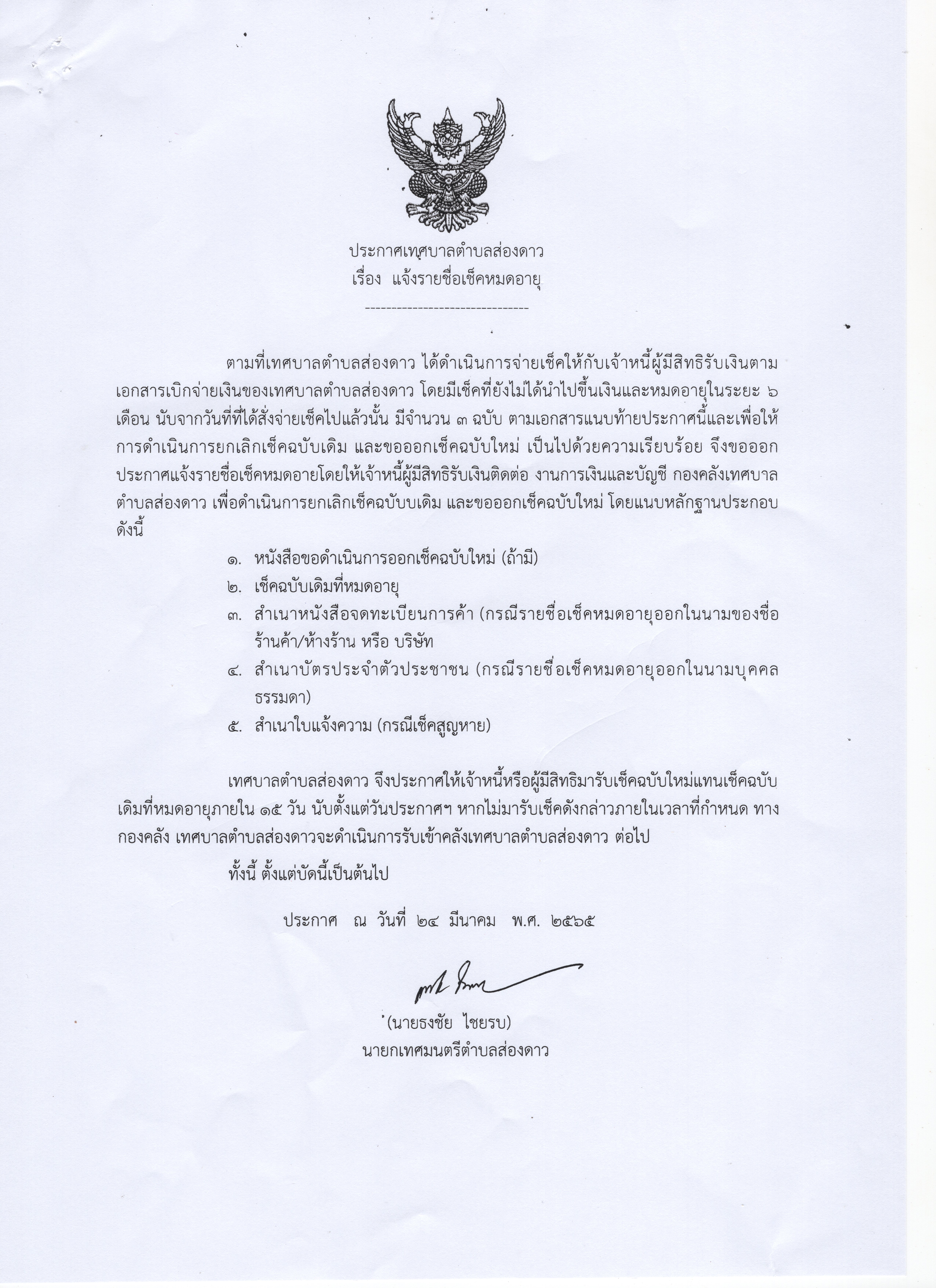 ประกาศเทศบาลตำบลส่องดาว เรื่อง แจ้งรายชื่อเช็คหมดอายุ
