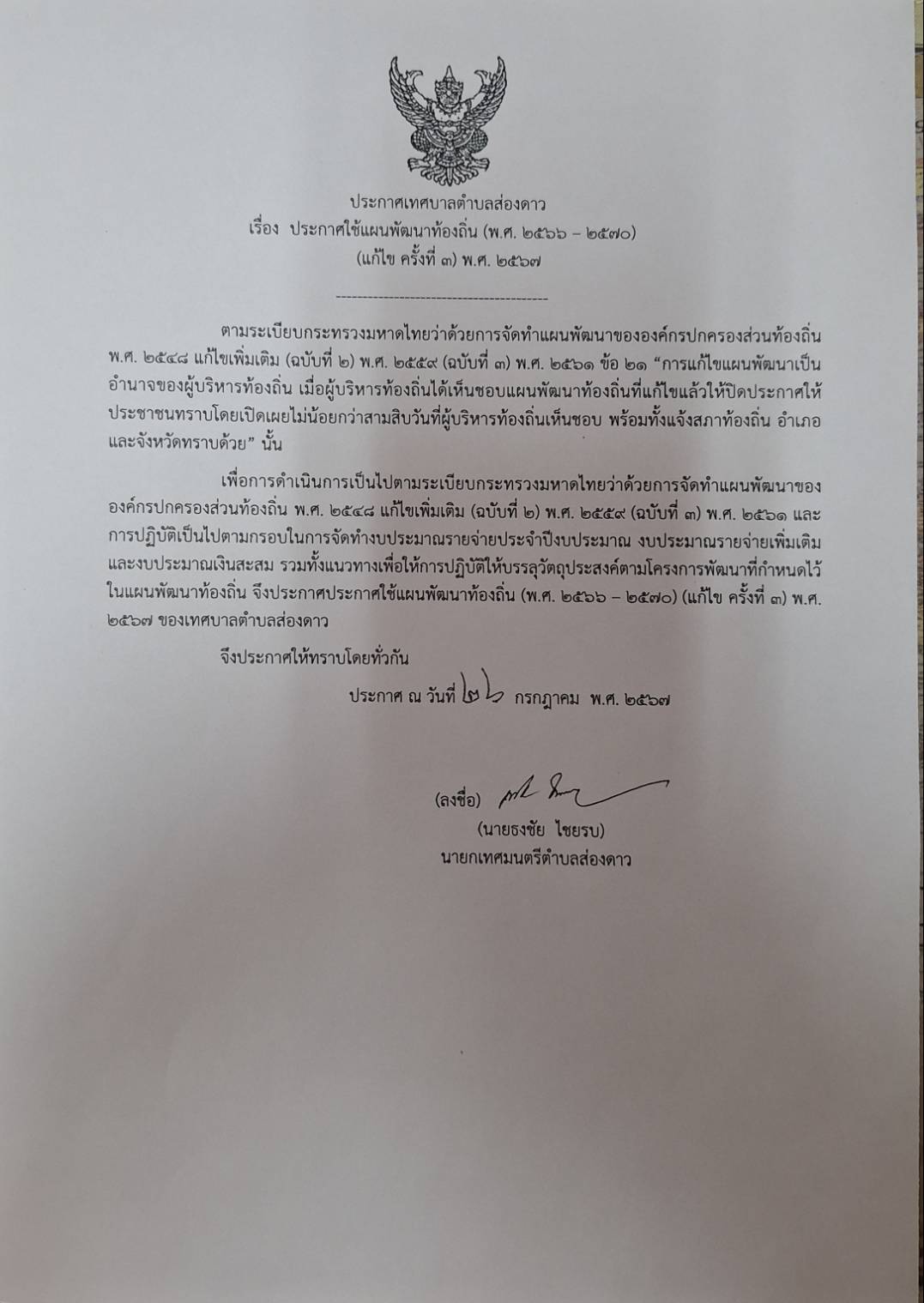 ประกาศใช้แผนพัฒนาท้องถิ่น (พ.ศ. 2566 - 2570) (แก้ไข ครั้งที่ 3 ) พ.ศ. 2567 เทศบาลตำบลส่องดาว อำเภอส่องดาว จังหวัดสกลนคร