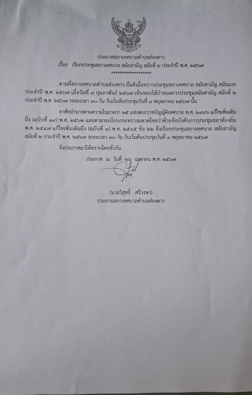 เรียกประชุมสภาเทศบาล สมัยสามัญ สมัยที่ 2 ประจำปี พ.ศ. 2567