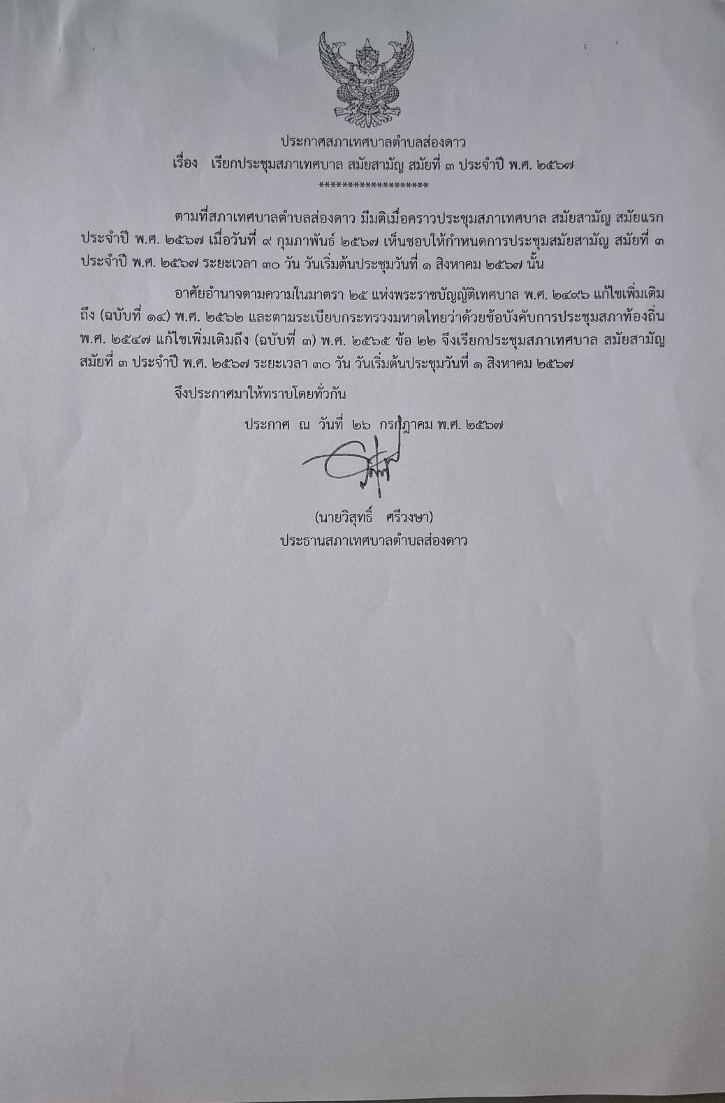 เรียนประชุมสภาเทศบาล สมัยสามัญ สมัยที่ 3 ประจำปี พ.ศ. 2567